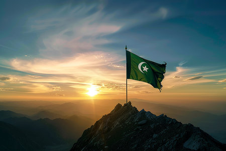 Generative AI Image of Pakistan Flag Fluttering on Rocky Hill Top at Sunset