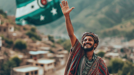 Cheerful Man Waving in Traditional Attire