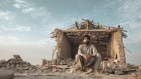 Portrait of a young man sitting in front of a hut in the desert
