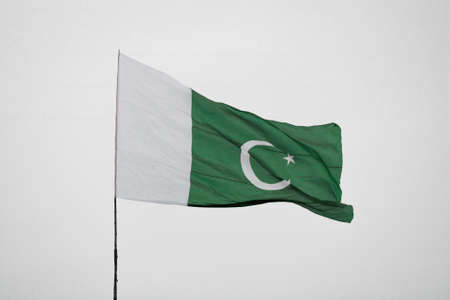 The national flag of Pakistan blowing in the wind against a white background.