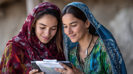 Two women wearing colorful scarves are looking at a tablet. One of them is holding a piece of paper