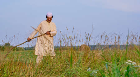 An senior asian man in an embroidered skullcap and white traditional Clothes mows hand-scythe grass in a hayfield. Country life concept