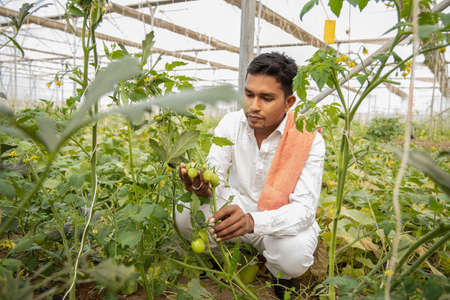 Young indian farmer inspecting or harvesting unripe tomatoes crop from his poly house or greenhouse, modern organic farming, agriculture concept, copy space.