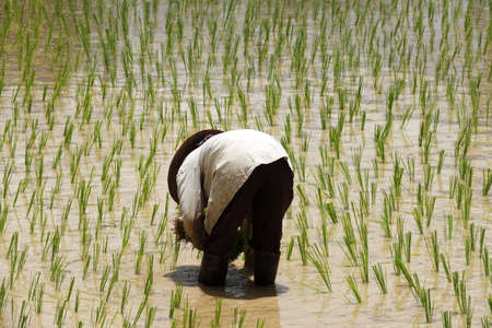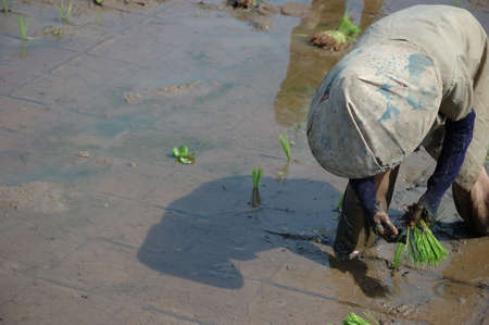 Agriculture/ Old farmer hand tenderly touching a young rice in the paddy field