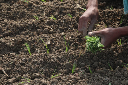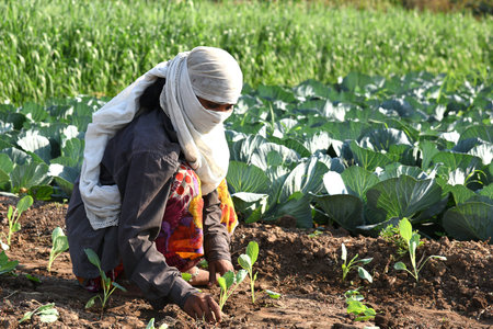 AMRAVATI, MAHARASHTRA, INDIA, 3 FEBRUARY 2017 : unidentified Indian farm worker planting cabbage in field and holding bunch of small plant of cabbage in hands at the organic farm.