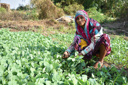 ALMORA, INDIA - november 6, 2020: portrait of an indian woman farmer standing in working in the green fields, smiling and looking into the camera.
