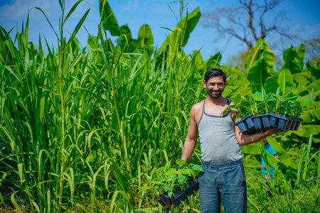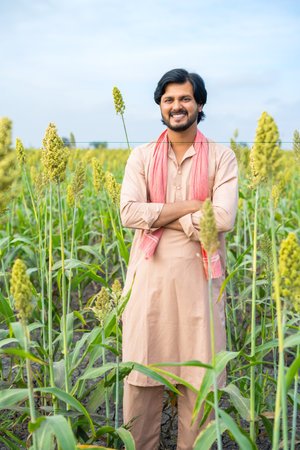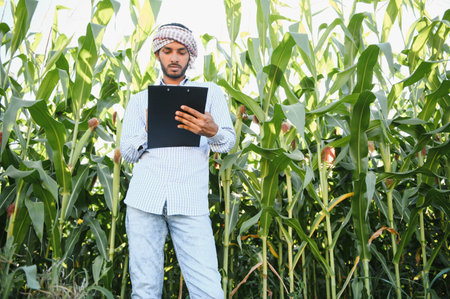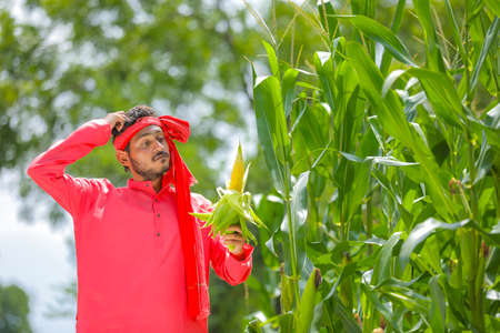young indian farmer or agronomist at corn field. The concept of agriculture