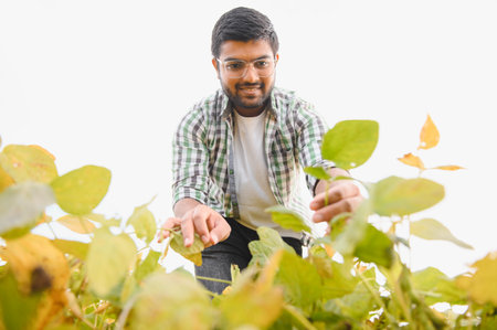 The concept of agriculture. An Indian farmer or agronomist inspects the soybean crop in a field.
