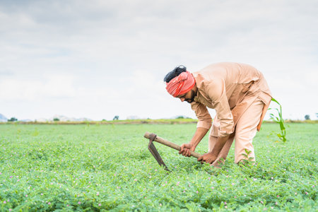 Farmer busy working at chickpea farm during cloudy day at farmland - concept of dedication, daily wager and hard working