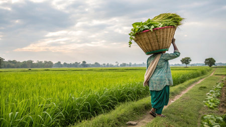 Farmer carrying a basket full of fresh vegetables on the rice field.