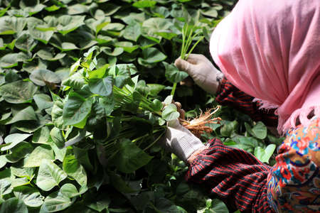 Female farmers are collecting sweet potato seedlings in the greenhouse.