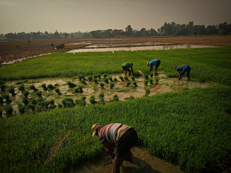 A group of traditional farmers working together in a lush green rice paddy, meticulously hand-planting young seedlings in the mud and water. The scene is set against a vast agricultural landscape under a soft, hazy morning sky, highlighting the intensive labor and communal effort involved in rice cultivation.