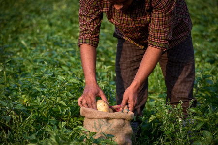 Farmer harvesting potato in the farmland. Potato Farming. Fresh organic potatoes in the field. Potato field with sacks of potato.