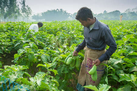 Bangladesh – November 25, 2014: A wniter day some farmers are harvesting green eggplants in thakurgong, bnagladesh.