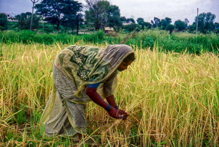 Indian woman cutting Wheat with sickle in farm at village Asangaon state Maharashtra India 04 16 2017