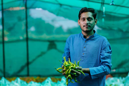 Indian Happy farmer holding green chilli , green chilli farming, young farmer