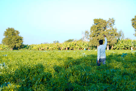 Young indian farmer collecting green chilly in plastic crates at green chilly field