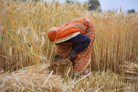 TIKAMGARH, MADHYA PRADESH, INDIA - MARCH 20, 2020: Indian woman cutting wheat with sickle.