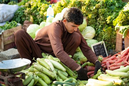 Islamabad, Islamabad Capital Territory, Pakistan - February 5, 2020, A young boy is selling vegetables in the vegetable market.