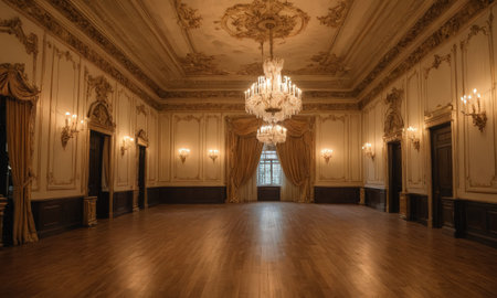 A magnificent crystal chandelier glows brightly, enhancing the intricate architectural details of the hall.