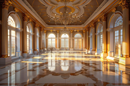 A breathtaking view of an elegant palace interior featuring grand arches and ornate details. The glossy marble floor reflects the soft light from crystal chandeliers, creating a tranquil ambiance.