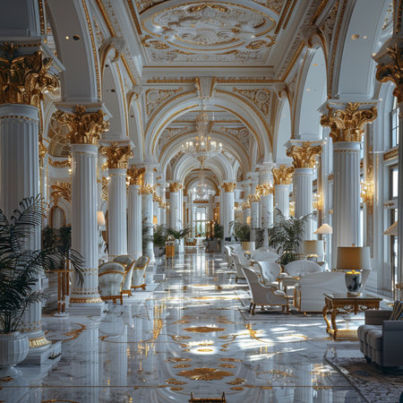 A grand hallway with ornate architecture. The floor is polished marble, and the walls are adorned with gold accents and intricate designs. Elegant chandeliers hang from the ceiling