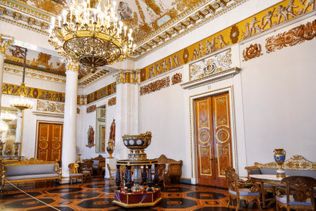 SAINT PETERSBURG, RUSSIA-APRIL 11,2018 : The interior of the Petrovsky Small Throne Hall in the State Hermitage, a museum of art and culture in Saint Petersburg, Russia.