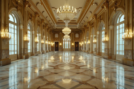 A grand hallway with ornate architecture. The floor is polished marble, and the walls are adorned with gold accents and intricate designs. Elegant chandeliers hang from the ceiling
