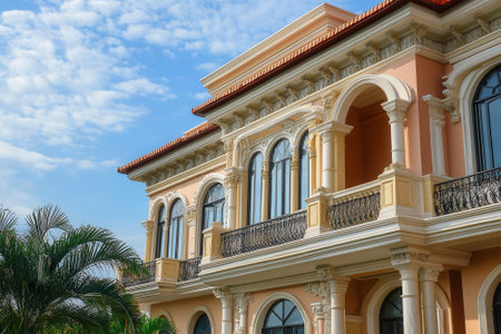 Elegant European embassy building with intricate design, no people. Plenty of room for text in the surroundings.