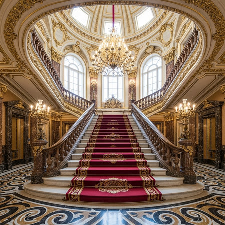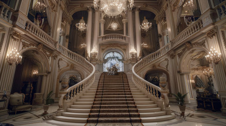 An interior shot showcases a grand staircase with a red carpet and elaborate architectural elements. The scene features white pillars, arched ceilings, and gold accents, conveying a sense of luxury. This detailed composition is suitable for various applications, including editorial and commercial projects.