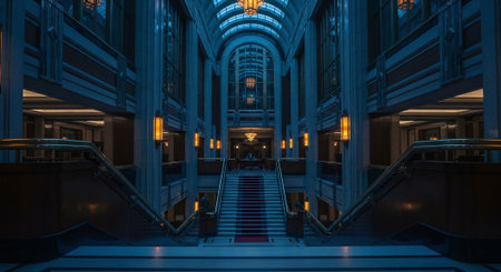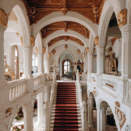 An interior shot showcases a grand staircase with a red carpet and elaborate architectural elements. The scene features white pillars, arched ceilings, and gold accents, conveying a sense of luxury. This detailed composition is suitable for various applications, including editorial and commercial projects.