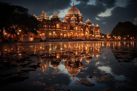 Akshardham Temple in New Delhi, India, serenely reflecting on a lake., generative AI