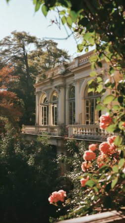 Colorful flowers bloom in the foreground while a majestic historical building stands in the background, surrounded by lush greenery and a bright sky.
