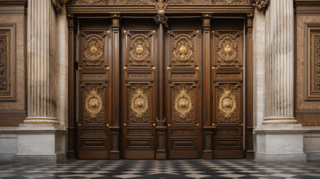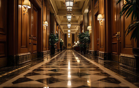 This image showcases the interior of a grand and opulent mansion,featuring a stunning hallway with intricate architectural details,including a magnificent staircase,ornate wood paneling,and a