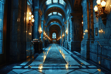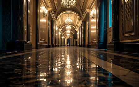 Polished marble floor inside a grand hall, showcasing numerous columns. The reflections of the columns on the floor are very clear and detailed. The light is warm and golden, casting an appealing ambience on the scene. The hall is characterized by symmetry and its architectural grandeur.