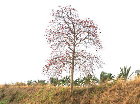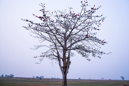 Lonely Bombax ceiba tree in the field under the blue sky