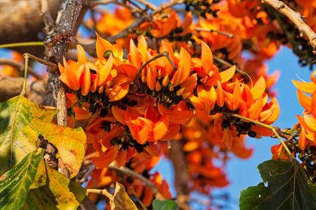 Orange blossoms of Erythrina edulis in a park during a sunny day in the winter. Branch without leaves. Lanzarote, Canary Islands, Spain.