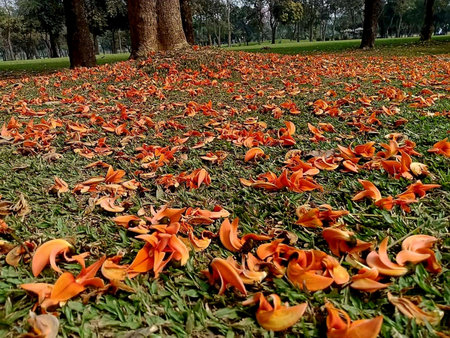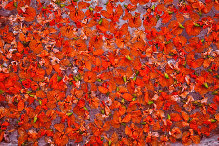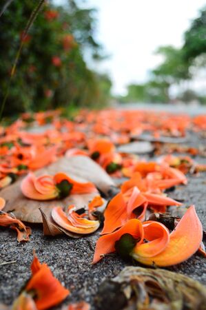 orange flower native to South Asia, Flowers fall from the tree.