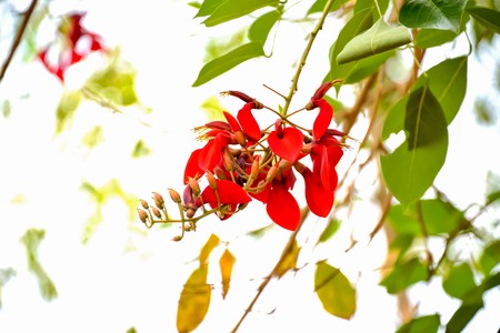 The beauty of the bright red coral bean flowers. The bark, leaves, roots and seeds of the plant with the scientific name Erythrina fusca contain alkaloid compounds.