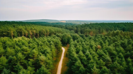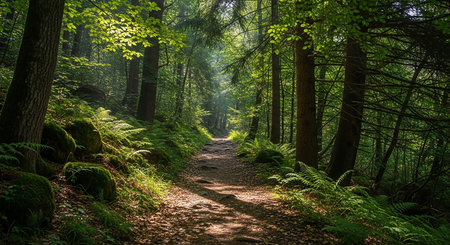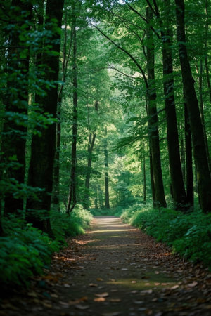 Serene dirt path meanders through dense deciduous forest with towering trees and lush undergrowth. Atmospheric lighting creates mystical mood perfect for nature, wellness, adventure