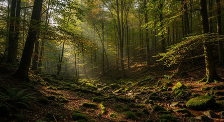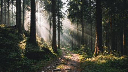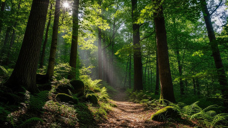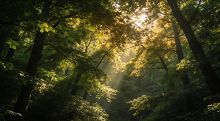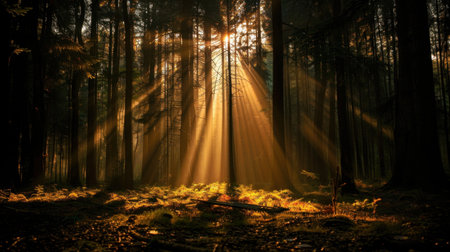 Sunbeams filter through tall trees in serene forest, creating beautiful silhouettes and illuminating lush undergrowth. warm light enhances tranquil atmosphere, inviting peace and reflection
