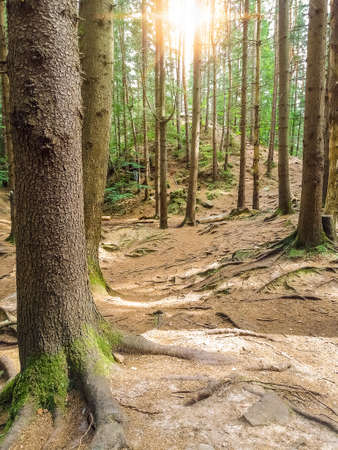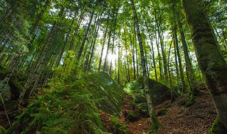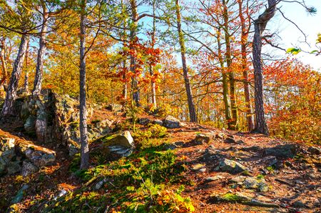Sun shining on a beautiful colorful forest. Trees have amazing autumn colors. Fall foliage, stones on the forest way. Hilly terrain in the wood. Seasons of the year.