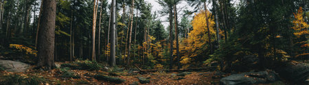 Panoramic forest scene with towering trees, autumn colors, and fallen leaves on the forest floor