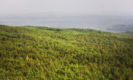 dramatic dusk wood land highland forest September nature scenic view rocky with trees environment space