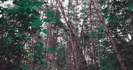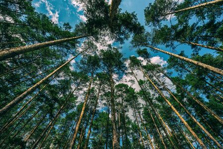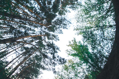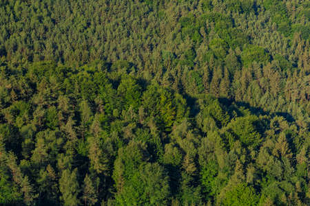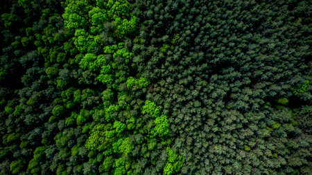 Beautiful natural scenic backdrop with green pine trees. Pine forest background