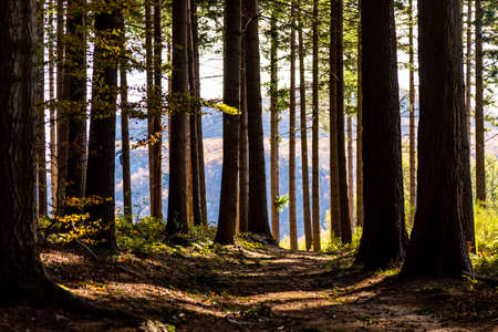 Suggestive forest interior with chiaroscuro. Sun rays penetrating inside a beautiful forest in autumn