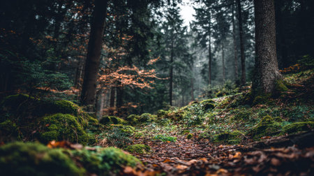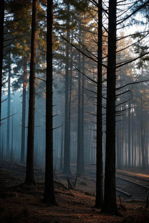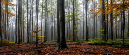 Foggy autumn morning in a dense forest, mysterious and serene,