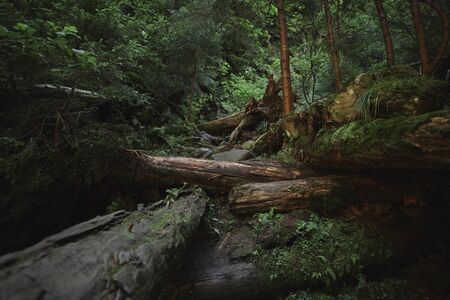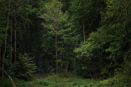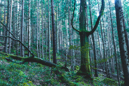 Dark gloomy haunted forest on an autumn evening. Awesome landscape in the fairytale forest