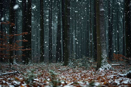 A cinematic photograph of snow falling in an endless forest with tall trees, the ground covered by fallen leaves and small plants. The trees have some fresh green foliage on them but also some old brown branches. It's a dark, snowy day. --ar 3:2 --v 6.1 Job ID: 51d6e20a-c979-45f0-83ca-3abd411eaa43