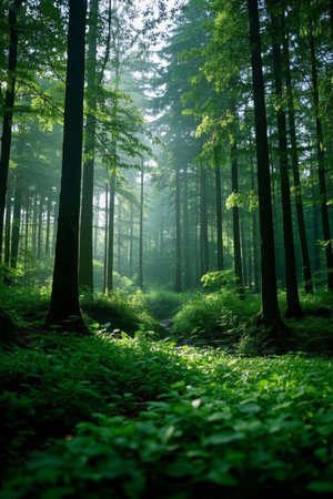 A captivating view of a misty forest featuring tall trees and vibrant greenery. Sunlight streams through the foliage, creating a serene atmosphere ideal for nature lovers.